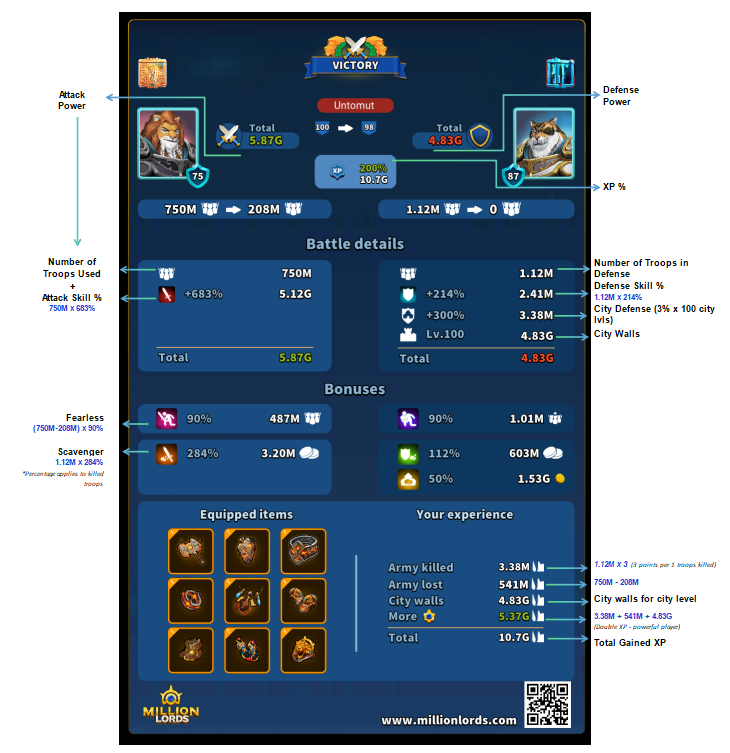 When opening a detailed battle report, you will notice details on the battle report which willoffer you essential information of the battle result and opponent's stats and troops.